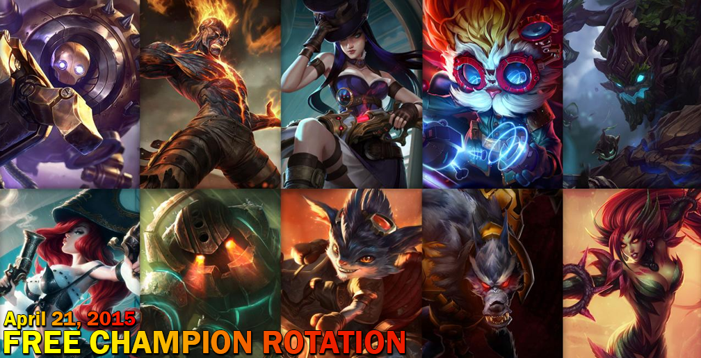 Free Champion Rotation – April 21 Posted in Free Rotations, Games, MOBA by Elu Heimerdinger Miss Fortune Caitlyn Zyra Rumble Blitzcrank Brand Maokai Nautilus Warwick April 20, 2015