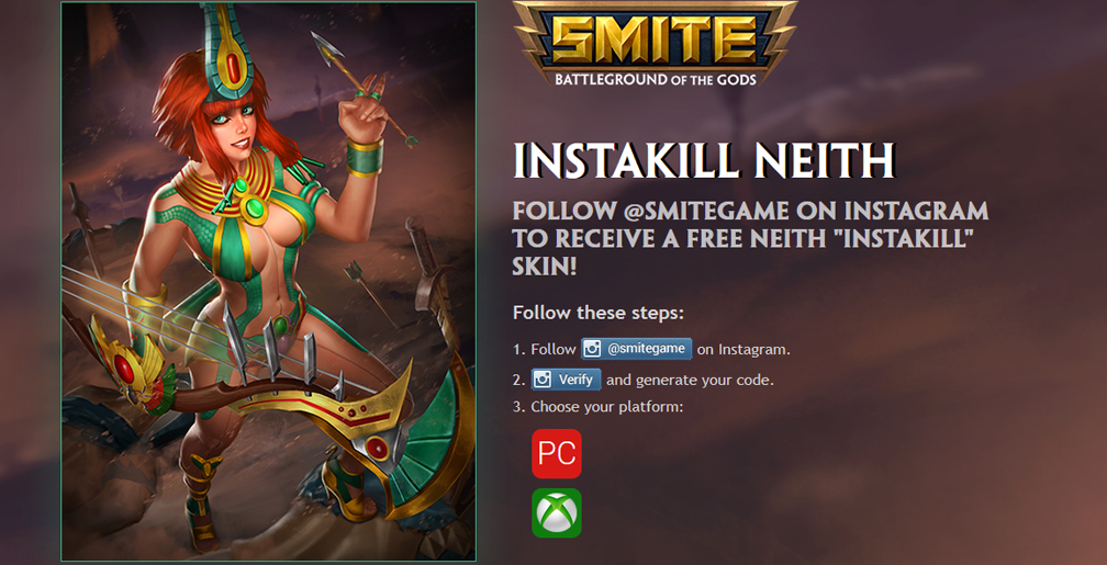 Get the FREE Instakill Neith skin (and God) by following SMITE on Instagram! Just click on the promotional link and follow the SMITE Instagram, click Verify, Authorize on the pop-up window and finally, click on the platform of your choice (PC or Xbox One). You’ll receive your code which can be redeemed in the Store, and heading over to Redeem Code. That’s it!